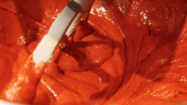 Bata la mantequilla y el azúcar hasta ligero y mullido. Lentamente, añada los huevos, asegurándose de que todo está incorporado. Mezclar la harina, polvo de cacao, polvo de hornear y sal junto. Tamizar la mitad de la mezcla de harina a la masa. Batir la mantequilla, vainilla y rojo alimento colorante junto y verter en la masa. A continuación, tamizar la harina restante. Agregar el bicarbonato al vinagre y pliegue a la masa. Hornear a 180 grados c/356 grados f por 25-30 minutos.