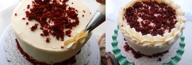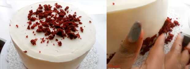 Se desmoronan cualquier trozos de pastel de terciopelo rojo con los dedos y se aplican a la parte superior central de la torta y la base inferior de la torta como una frontera.