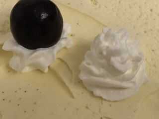Decorar con flores poco hacer crema chantilly todo alrededor de la circunferencia. Coloque las cerezas confitadas en los florettes crema batida.
