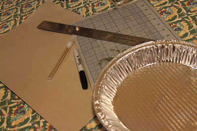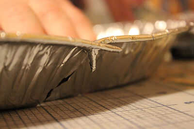 Finalmente, corte dos pedazos de cartón, la altura de su lata de pastel y la longitud de un lado del interior de su pie-ogram. Asegúrese de utilizar un cartón no corrugado (incluso algo así como una caja de cereal esta bien). Cubre la cartulina en papel de aluminio. Esto formará las paredes interiores. Tenga en cuenta que usted puede reutilizar su bisel lata de pastel que fue cortado (si está en una sola pieza), pero me resulta mucho más difícil garantizar, y el bisel natural hace difícil construir una base de tarta alrededor.