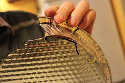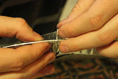 Ahora, donde ese arco se cruza con el borde de la lata, cortar el lado y el bisel lata, dejando un reborde y ficha para ayudar a estabilizar la estructura bajo el recubrimiento de la hoja.