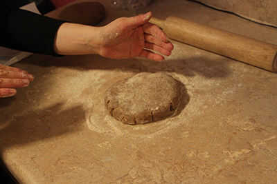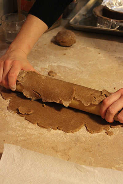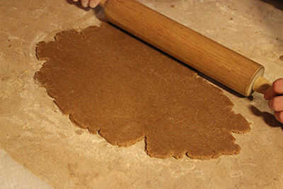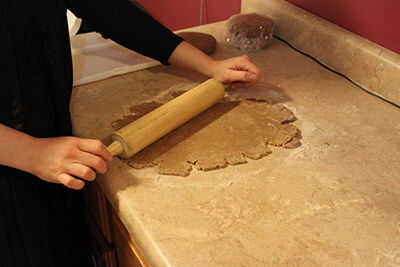 Ahora, conseguir tus cortezas de pastel frío-pero-todavía-maleable de la nevera. Espolvorear un poquito de harina sobre una superficie limpia contador y resultan un pastel redondo. Usando un rodillo ligeramente enharinado, comenzar a estirar la masa. En lugar de rodar hacia adelante y hacia atrás (como podría ser intuitivo), el rodillo en una dirección a la vez, desde el centro hacia el borde, hasta que has estirado la masa lo suficientemente grande para insertar en una parte de su pastel-ogram.