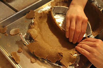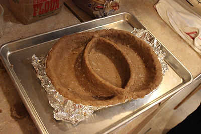 En primer lugar, asegúrese de que sus placas forradas pie-ogram están sentados en la bandeja de goteo cookie hoja, lista para recibir una corteza inferior. Debido a la mantequilla que fue cortada en la base de tarta ya, no necesita agregar más mantequilla o grasa a la lata forradas para liberar su pie más adelante. Si fuese pastel, entonces sí. Pero para esto, no hay necesidad.