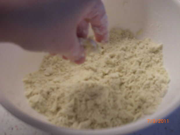 Entonces rápidamente trabajar junto con sus dedos hasta que alle la mantequilla se mezcla y se ve como breadcrumps.