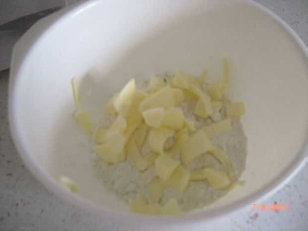 Cortar la mantequilla en la harina, esto hace más fácil trabajar juntos antes de que la mantequilla se derrita.