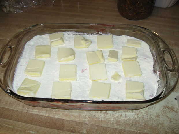 Cortar tus dos trocitos de mantequilla y lugar a lo largo de la parte superior. Usted no tiene que cubrir cada poco de mezcla para pastel, pero quieres tener cobertura incluso sin enormes huecos.