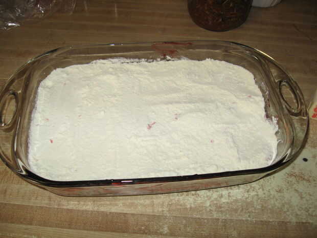 Suavemente suavizar la mezcla de torta sobre el plato entero, hacia los lados, rompiendo cualquier grumos grandes como vas. Con cuidado es importante, que no quiere incorporar la mezcla de la torta con el pastel relleno de mezcla.