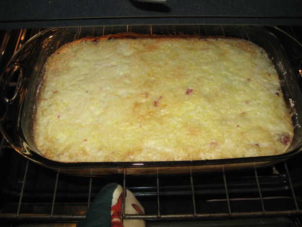 Este fue mi pastel en 45 minutos. Está comenzando a obtener oro, pero es todavía un poco pegajosa. Quieres ver una agradable, incluso relativamente dorado en la parte superior. Debe verse un poco "crujiente" en lugar de ligeramente "húmedas".