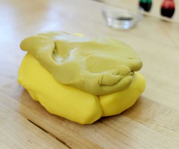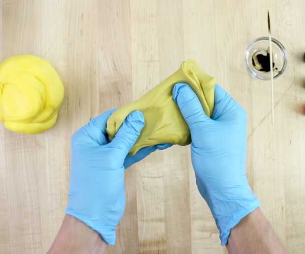 Mezclar el colorante en el pedacito de fondant. Luego añadir a la parte más grande y amasar/mezcla les juntos hasta que tenga un color uniforme. Debe ser ligeramente verde/marrón amarillo. (como en la foto)