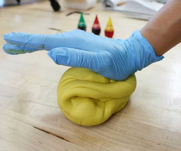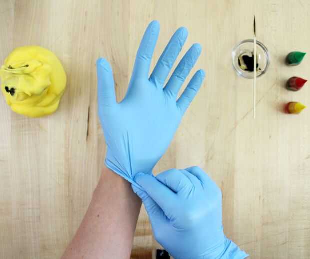 El colorante es bastante potente, por lo que para proteger sus manos de conseguir teñidos junto con el fondant, es una buena idea poner un par de guantes de látex no. (Aprendí la manera dura que fondant se pega al látex).