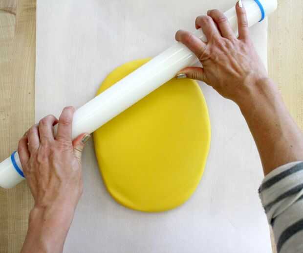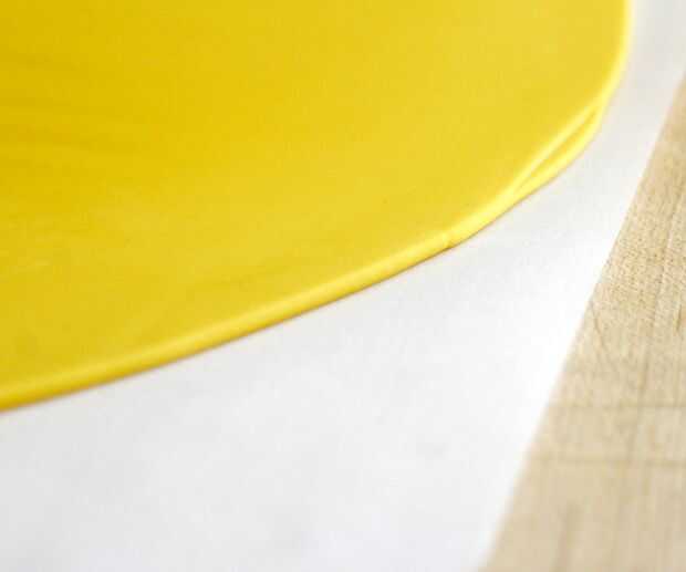 Coloque un gran pedazo de pergamino en la superficie de trabajo. Desenvuelva el fondant y coloque en el centro de pergamino.