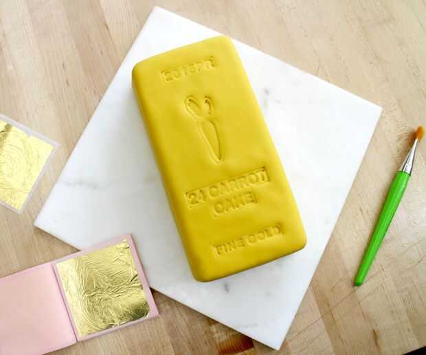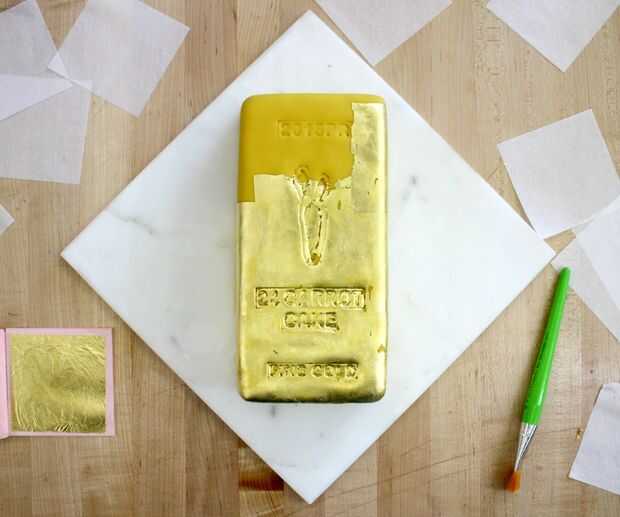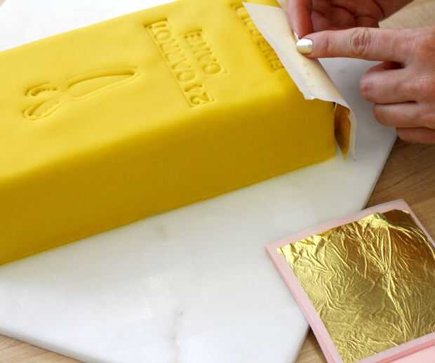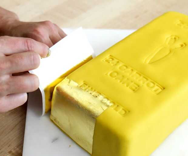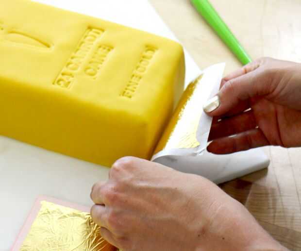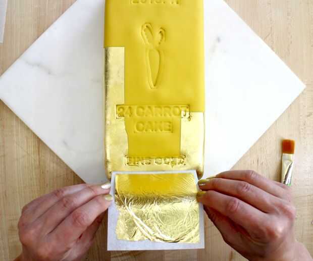 Repita el proceso de colocación de hoja de oro hasta que han cubierto el pastel entero. Superposición de las hojas de la hoja no es un problema se mezclan muy bien y apenas se nota el parche trabajo de capas.