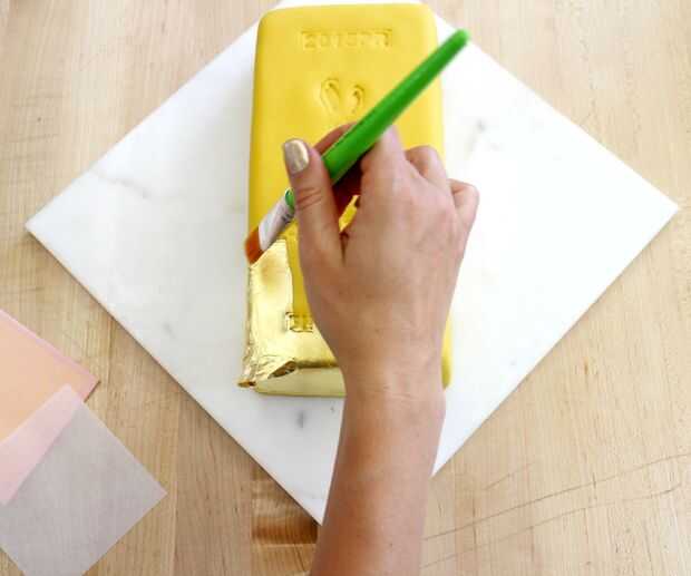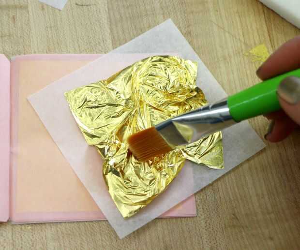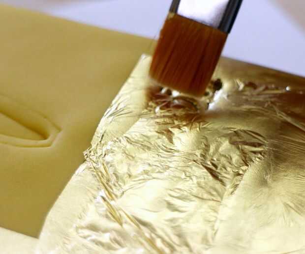 Tomar el pincel suave y cepillo muy suavemente la hoja de oro sobre la superficie de la torta.
