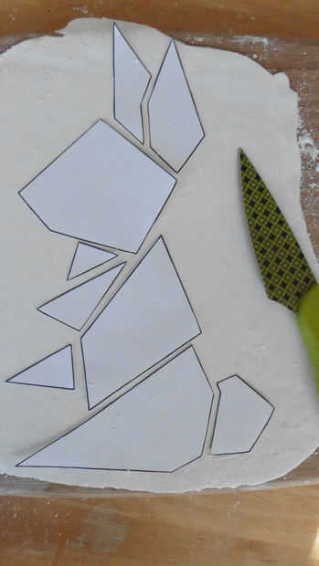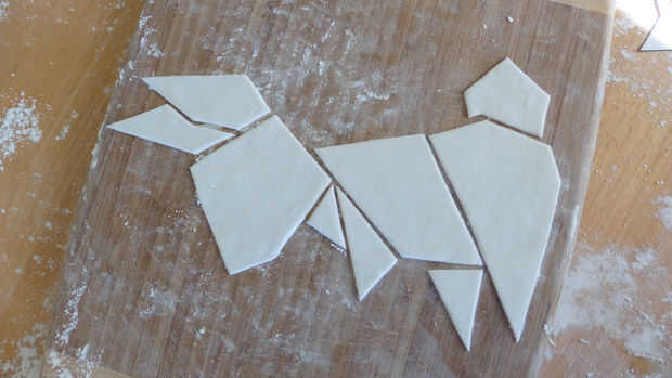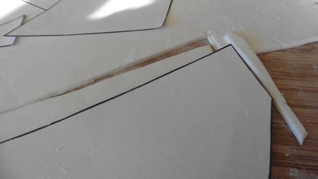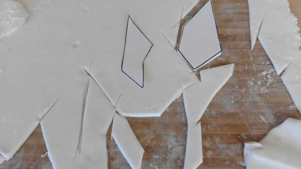 Estirar el fondant en una hoja fina lo suficientemente grande como para cubrir el área de la plantilla. Coloque los pedazos de papel sobre el fondant para que pueda saber exactamente dónde cortar. Use un cuchillo para tallar las piezas hacia fuera.