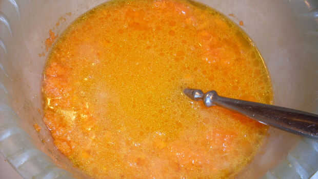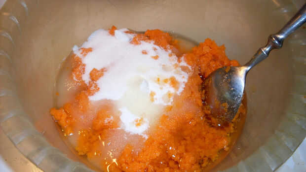 En un tazón grande, combine las zanahorias, el azúcar y el aceite. Vierta el agua sobre la mezcla. En otro recipiente, combinar el resto de los ingredientes. Añadir a la mezcla de zanahoria y mezclar bien. Vierta en un molde antiadherente o ligeramente aceitado 8" cuadrado. Hornear durante 25-35 minutos, dependiendo de su horno.