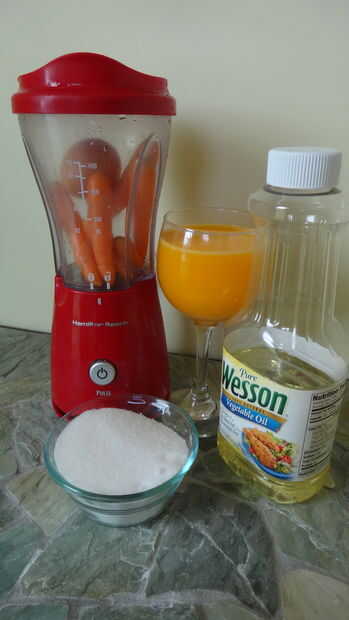 Añadir los huevos, azúcar, zanahoria, aceite y jugo de naranja a la licuadora. Mezcla hasta que esté suave, aproximadamente 2 minutos.