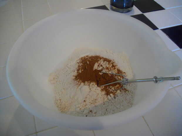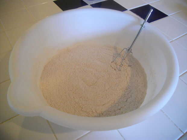 Agregue los ingredientes secos a tazón. Me gusta tomar un diente de mi batidora de mano y combinar todo. Fácilmente se puede usar un tamiz para esto, pero soy perezoso.