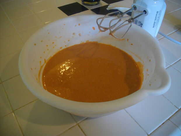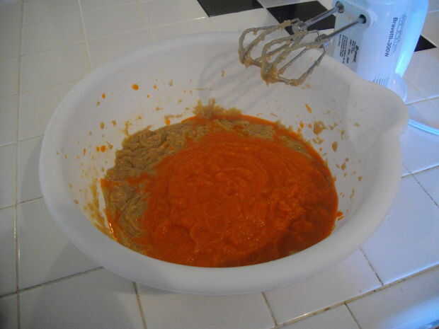 Añadir a la papilla de zanahoria a la mezcla, utilizando la espátula pequeña para conseguir todo lo que puede salir de los frascos. Mezclar bien.