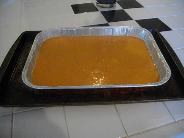 Vierta la masa en la sartén, asegurándose de utilizar su gran espátula para raspar cada pedacito del tazón de fuente. (Me encanta mirar la red alimentaria y siempre con la irrita me cuando salen de la mezcla en el recipiente). Siempre pongo los botes desechables en una placa para horno para darles un poco de estabilidad adicional.