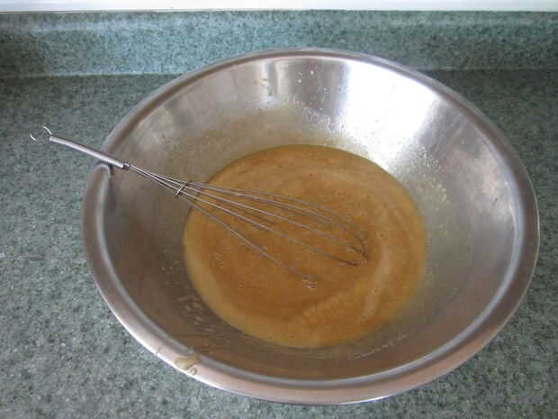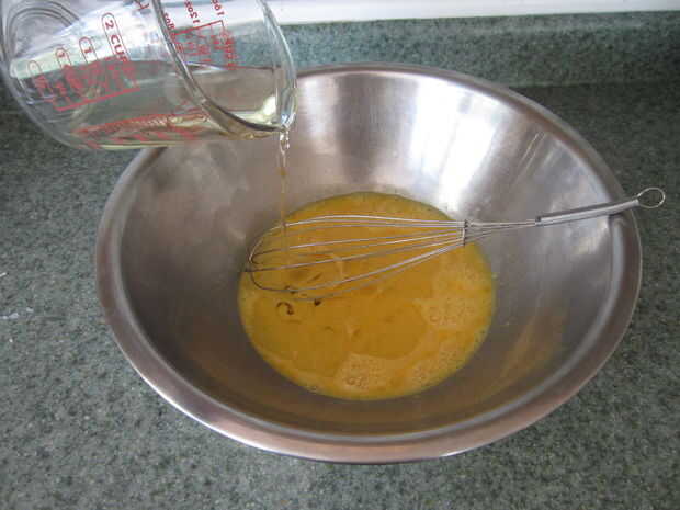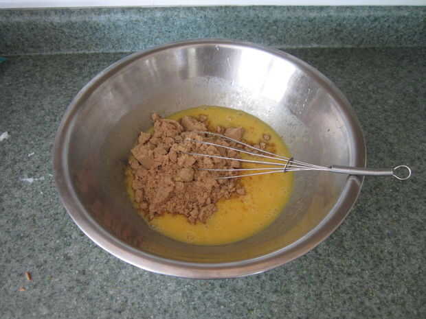 En un tazón bate los huevos; Añadir el aceite y batir; Añadir el azúcar moreno y batir hasta suave.