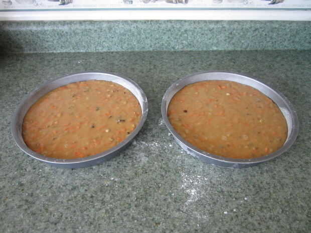 Extender la masa uniformemente en el molde para pasteles; y coloque el recipiente en el centro del horno precalentado. Hornear hasta que la torta es firme, y un pico de madera insertado en el centro sale limpio, unos 40 a 45 minutos o más si es necesario