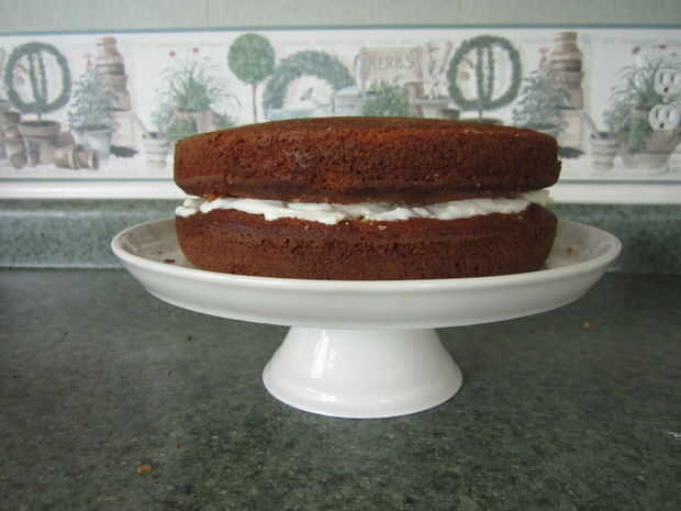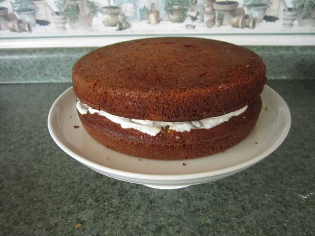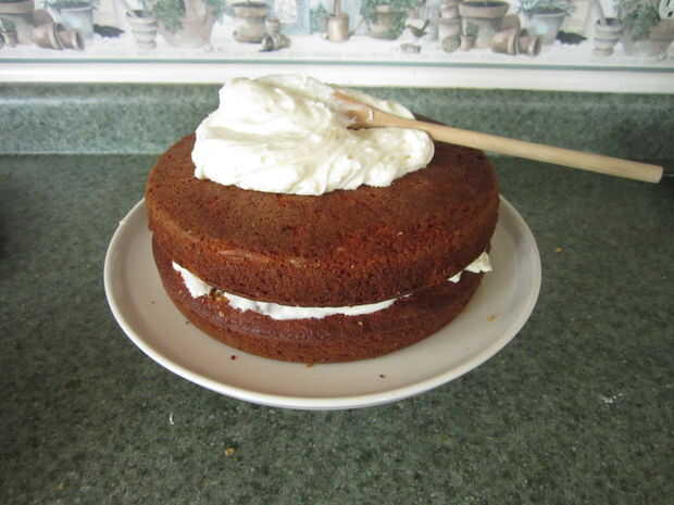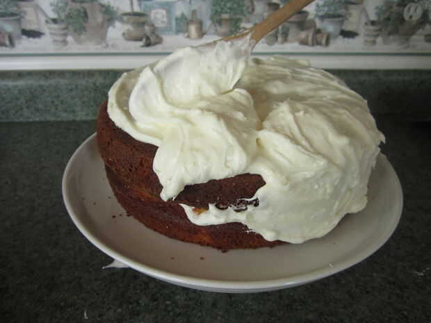Coloque un pastel en una placa o soporte de la torta. Suavizar algunas Glas en. Luego coloque otro pastel, boca abajo sobre el primer pastel.