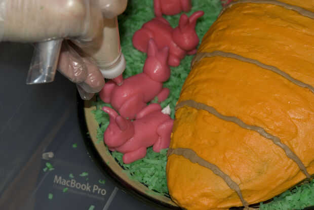 En un bol grande mezclar una bolsa de coco rallado añadiendo el colorante verde. Dejar de añadir colorante al llegar el color que desee. Agregue el coco alrededor de la zanahoria y colocar el conejo en coco. Con los conejos en su lugar añadir la cola con un punto de glaseado blanco.
