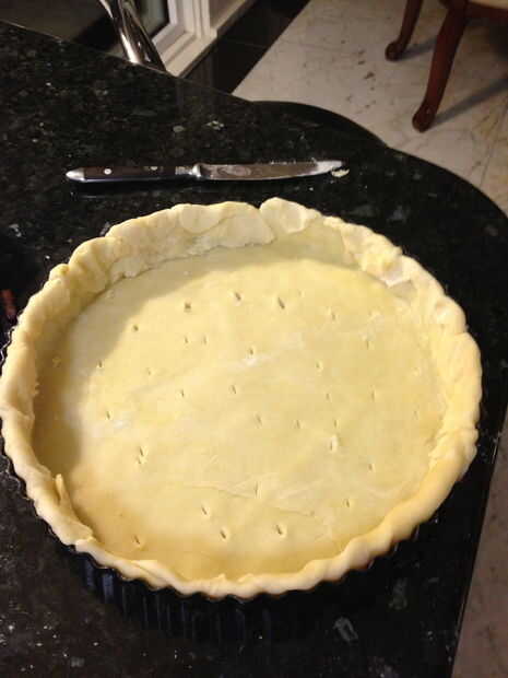 Una vez hecho eso hacia fuera la pasta y colocarla cuidadosamente en la bandeja de la tarta. Un tenedor y pinchar algunos agujeros en la parte inferior de la cacerola, hornee ciego! 15 minutos con pastel pesos (frijoles o arroz) y a 5 minutos con los pesos.