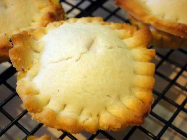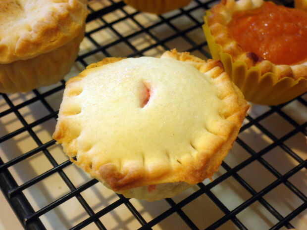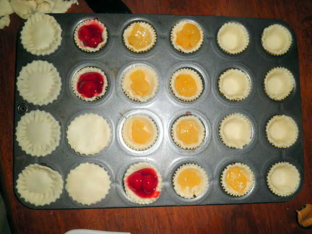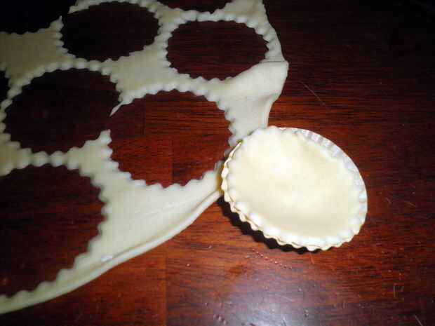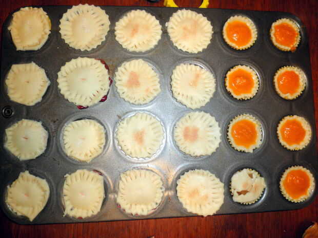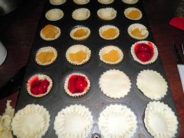 Utilizando un llenado de la cuchara las cortezas con la mezcla de pastel de calabaza, rellenos de cereza pasteles o tarta de manzana relleno. Tienes que cortar las manzanas un poco de manera que encajan en las cortezas.