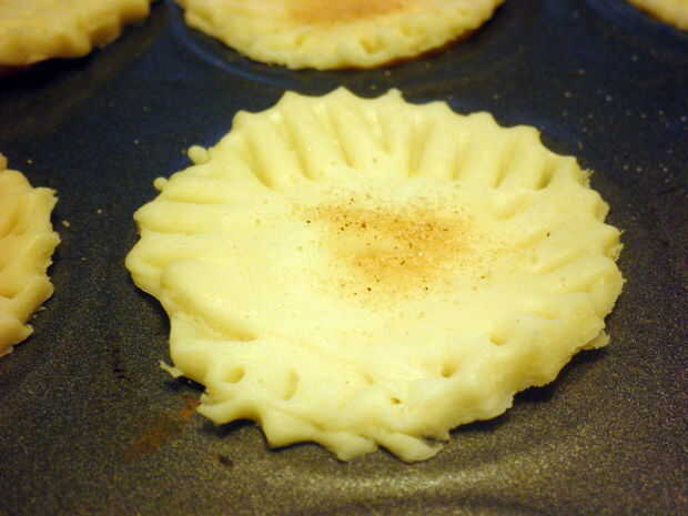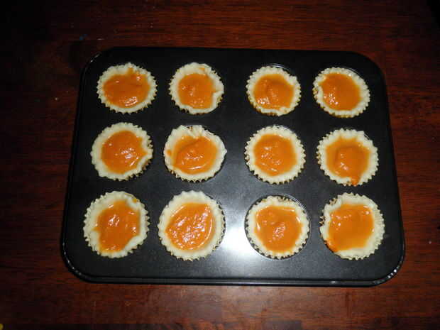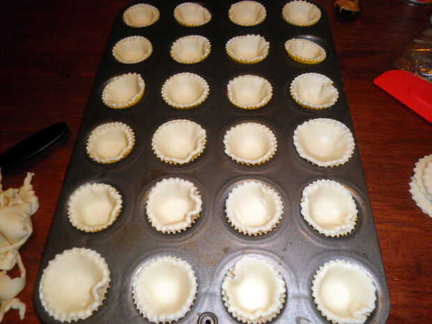 Rodillo hacia fuera la base de la tarta. Luego utilice un cortador de galletas pequeño para cortar círculos de la masa. Abrir las envolturas de cupcake mini y colocar los círculos de masa sobre ellos. Luego coloque las envolturas de la Magdalena con la masa en ellos en la bandeja de mini cupcake.