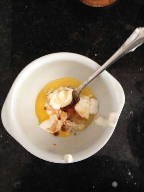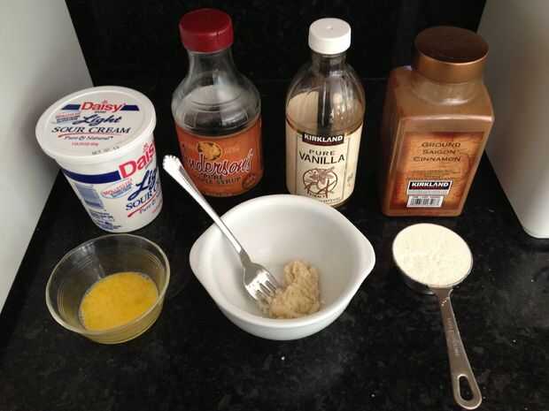 En un tazón de fuente separado de su taza, mezclar la mantequilla y azúcar juntos hasta que estén cremosa y completamente combinados. Añadir el huevo, crema, jarabe y vainilla. Una vez combinados, añadir la harina. Pour la mitad de la masa de en la taza (el uno que se va en el microondas!). Además de eso, espolvorear 3/4 del relleno. Vierta la masa restante, espolvoree sobre el relleno restante. Microondas durante 1 minuto 30 segundos y comprobar si está hecho tirando del borde de la taza: Si está muy húmeda, ponerlo en durante 30 segundos. Desde mi experiencia, demasiado no microondas algo. Tener cuidado al sacarlo del microondas, estará muy caliente! ¡ Disfrute!