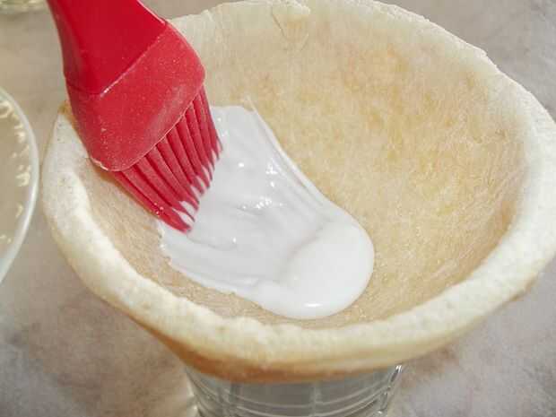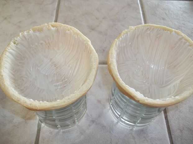 Derrite aproximadamente 1 onza de chocolate según las instrucciones del paquete y en el interior de ambas mitades. Selle el interior de la corteza contra la humedad el budín y se proporciona soporte estructural para la esfera. Coloque las dos mitades en dos vidrios pesados o tazas para evitar que rueden. Refrigerar hasta que el chocolate esté firme, aproximadamente 5-10 minutos, dependiendo del grosor del chocolate.