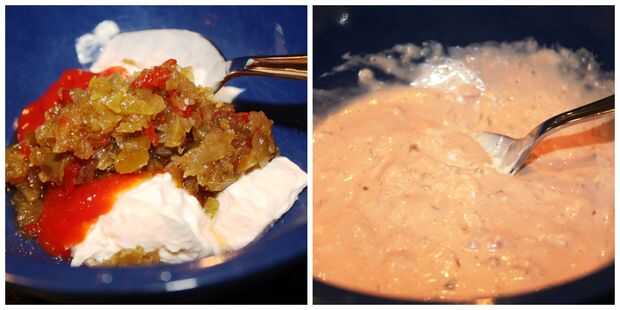 Una vez cebollas apártelos apagado de calor. Probar la mezcla de carne y retocarlo con cualquier especias que crees que necesita más. Tiempo para hacer la salsa! Añadir mayo, ketchup, un chorrito de vinagre blanco y una buena cantidad de dulce salsa en un tazón mediano. Mezclar bien y probar. Añadir más condimento a gusto.