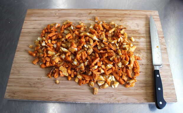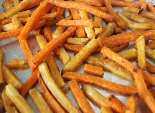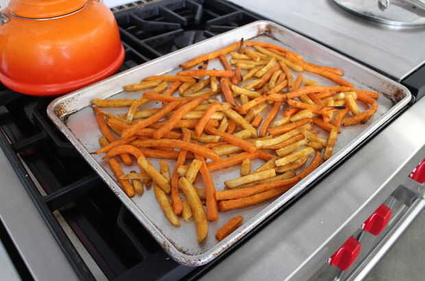 Precalentar el horno a 415 grados f el. difundir las congelados papas fritas y batatas en una hoja para hornear y un lugar en el horno durante 20 minutos. Picar las papas después de la cocción.