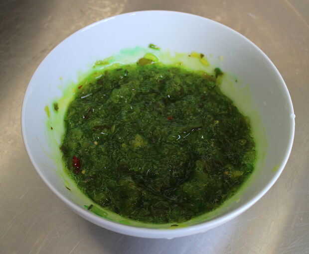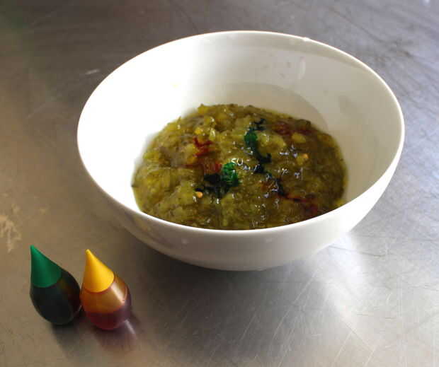 Vierta la salsa en un cuenco con dos o tres gotas de colorante verde y amarillo. Mezclar hasta que la salsa es verde brillante.