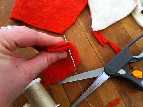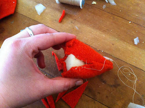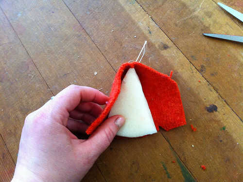 Envuelve la naranja de fieltro alrededor de la cuña, asegurándose de que cubre los lados y la parte superior de la cuña. Recortan, dejando un poco de exceso para asegurarse de que no hay espuma mostraría a través después de la corteza fue unida.
