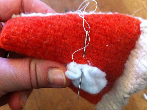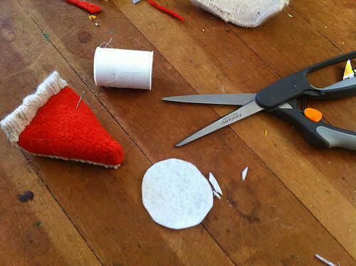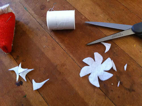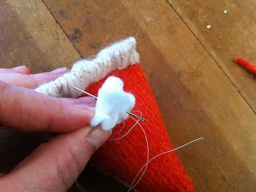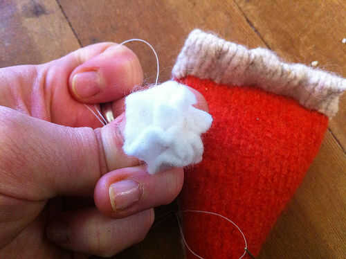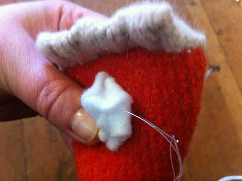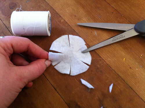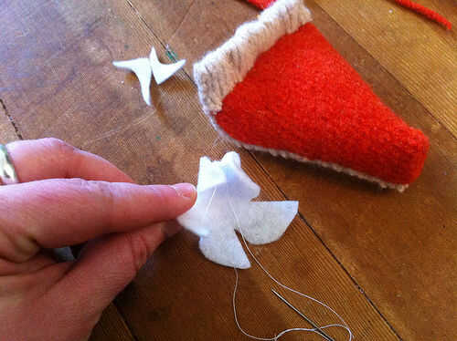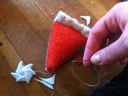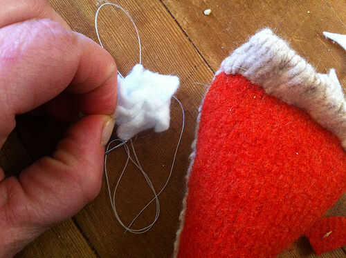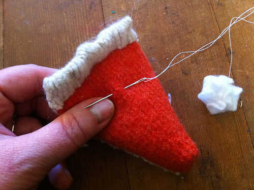 Puntada de la batida en la parte superior de la tarta; Pase la aguja a través de la roseta de fieltro blanco, luego a través de una pizca del pastel relleno de tela un par de veces alrededor del perímetro de la roseta. Un nudo, luego empuje la aguja en el pie y la espalda, recorte de exceso de hilo para que la cola del hilo está dentro de la empanada.