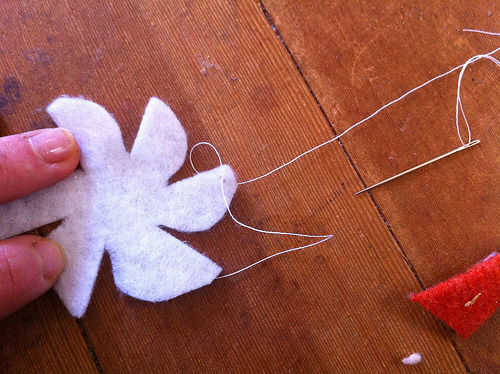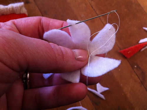 Pase la aguja roscada dentro y fuera de uno de los puntos de la forma de su flower-ish y haga un nudo para sujetar la punta. Pase la aguja dentro y fuera de la punta siguiente, continuar todo el camino alrededor del exterior de la flor, luego tirando del hilo apretado. Este debe reunir todos los puntos.