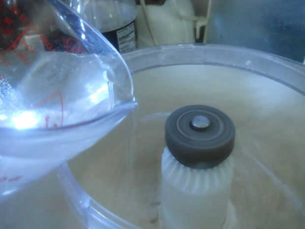 Agregue las 2½ tazas de agua tibia. Mezcla