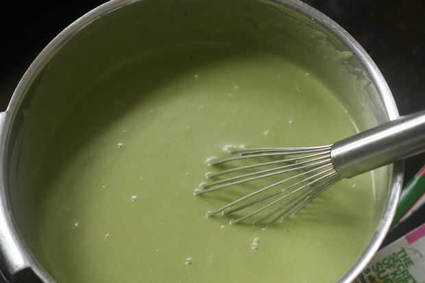 Con cuidado verter los ingredientes mojados sobre la mezcla de harina mochiko y bata hasta que la mezcla quede suave y uniforme en textura.