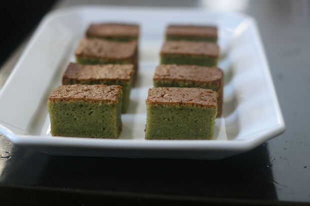 Permitir que la torta enfríe durante 30 minutos sobre una rejilla, con cuidado darle la vuelta a y cortar 24 cuadrados, o el tamaño de su elección. Puede almacenar pastel mochi durante tres días, cubierta.
