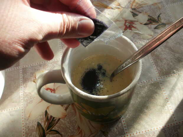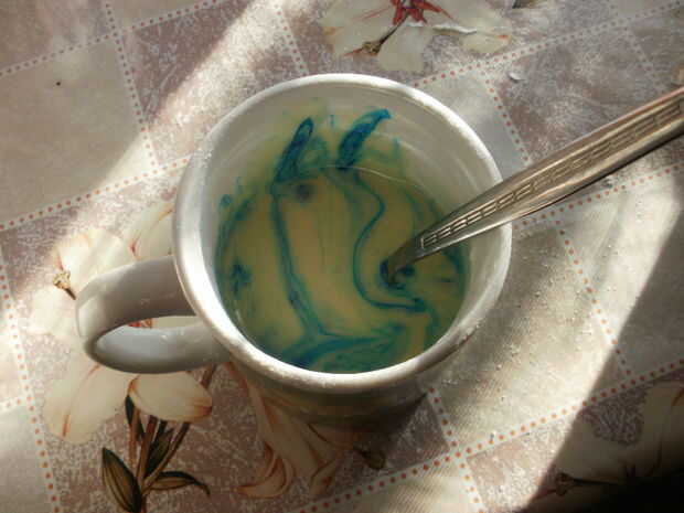 Cuando se realiza la mezcla he separado 1/2 taza de él y he añadido la pintura y remueve hasta que el color llega incluso.