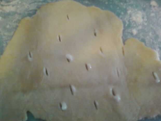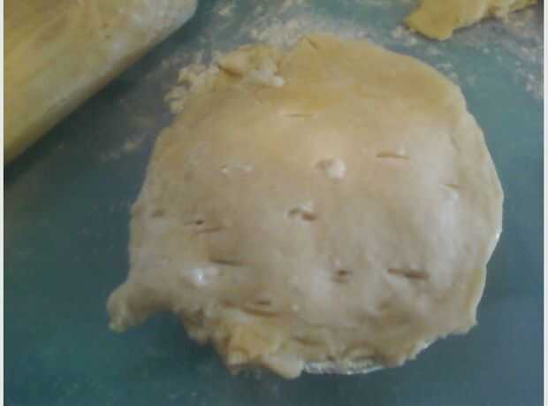 I tomó la otra mitad de la tarta y rodado hacia fuera y le añadió los agujeros.  Luego poner encima de la tartera y empuja arriba y abajo para "sellar".