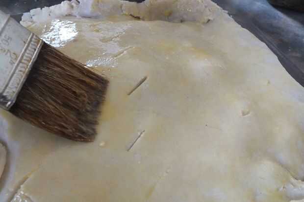 Cepillo de pastelería con un lavado de huevo (1 huevo batido + 1 cucharada de agua) alrededor de los bordes del plato y presione la pasta en la cazuela. Pincelar la masa generosamente con lavado de huevo restante.