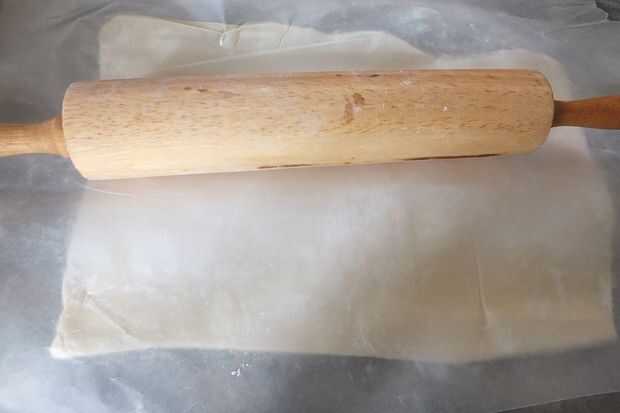Desenvolver la masa y hacer entre 2 hojas de papel de cera que han sido ligeramente enharinadas.