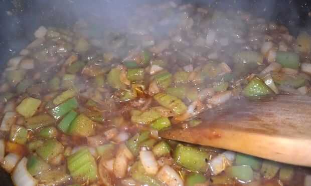 Luego agregar la cebolla, apio, pimiento verde, ajo, inglesay Salsa picante.