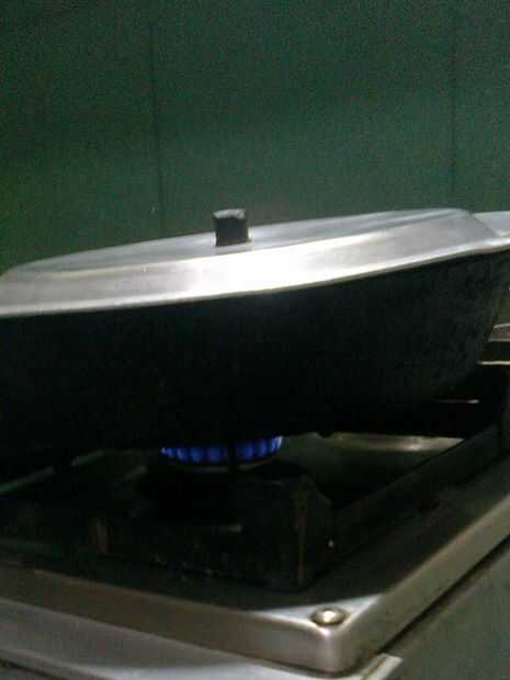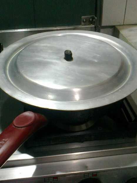 ahora en la otra estufa Precaliente el sartén y voltear la olla sartén. y coloque la tapa para dejar al otro lado Haz cocinado.