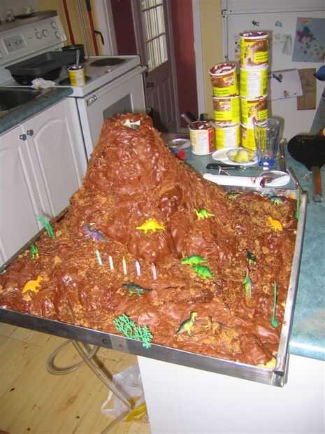 Esta parte me tomó sobre 8 hrs, 7 mezclas de torta y 11 latas de betún. He hecho mis propios pasteles y glaseados de cero antes pero esta vez sólo quería hacerlo rápido (si se llaman 8 horas rápido). Puedes ver a los tubos para los tiradores de polvo de coco colgando por debajo. Son visibles sobresale de la cima del volcán si se mira cerca. Yo también espolvoreado la cima del volcán con glaseado de azúcar para que se vea bueno de nieve (no se muestra en esta imagen) puse suficiente plástico dinosaurios (comprados en paquetes de 6 desde el almacén del dólar) alrededor del volcán que todos los niños en la fiesta con su rebanada. Me aseguré de poner algunos de los dinosaurios en el camino que llevaría a la lava.