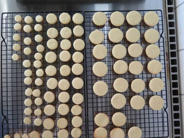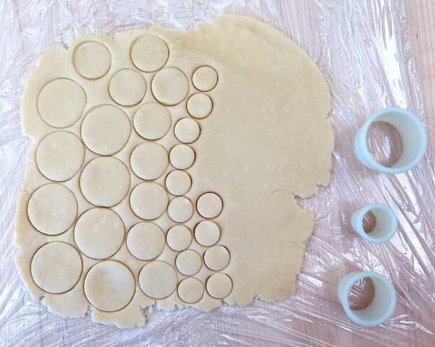 Utilicé los cortadores de la galleta que fueron cerca de 3/4 pulgadas, 1 1/4 pulgadas y 1 3/4 pulgadas. Para mi las galletas tenían que hornear sobre: