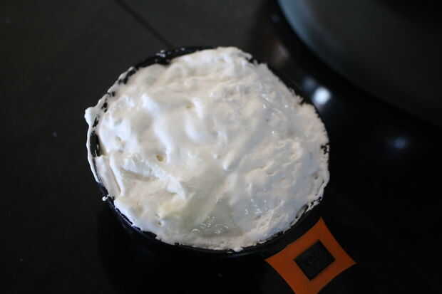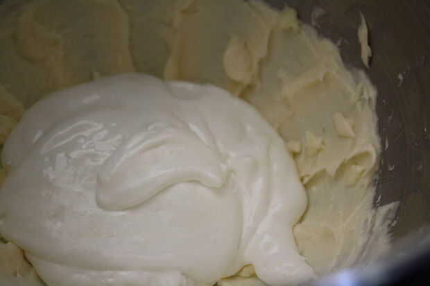 Una vez hecho esto, mezcla en la pelusa de la melcocha y bate bate bate hasta que se pone esponjoso y "batida" buscando. Como ya he mencionado antes en las puntas, puede Agregar un poco más de azúcar si usted siente que es demasiado que moquea después de batir abundante.